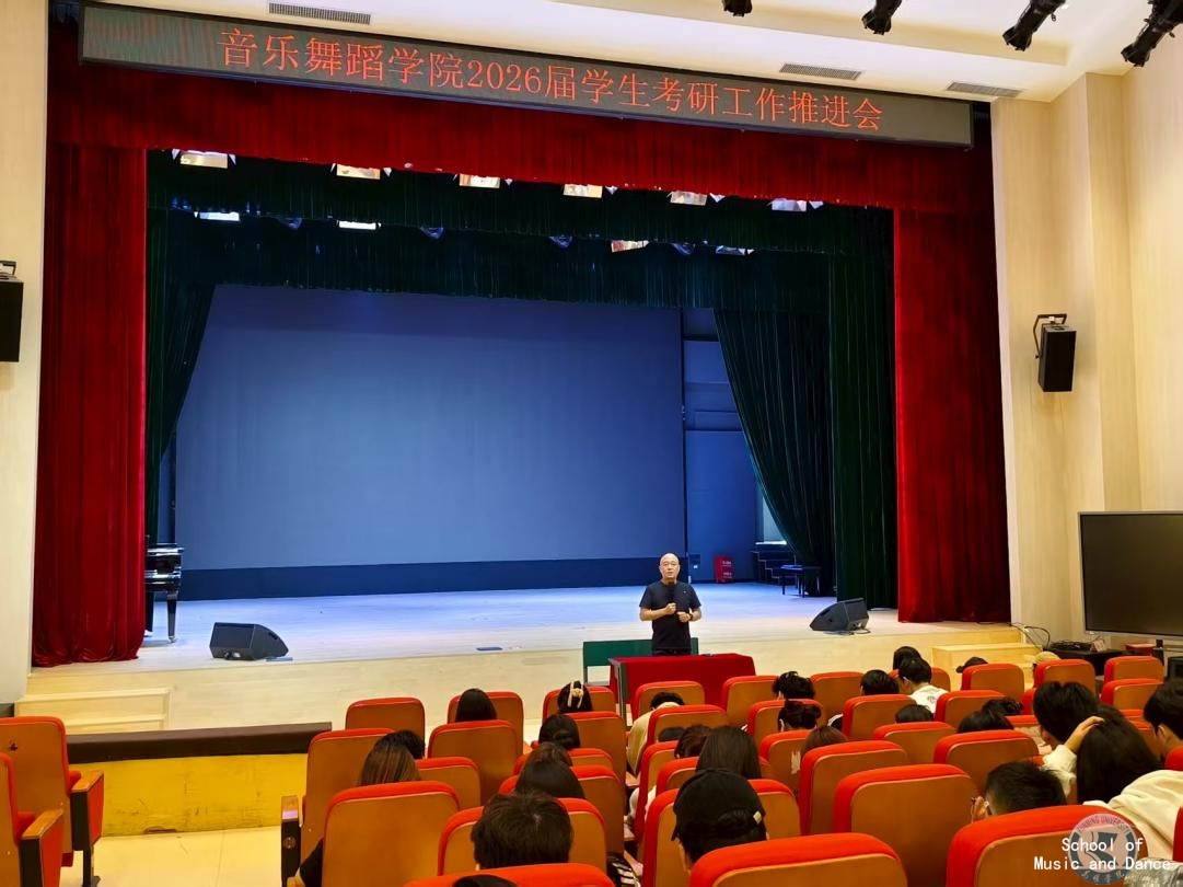 为进一步推动学院人才培养质量提升,加强对2026届学生考研工作的指导与服务,营造积极向上的学习氛围,音乐舞蹈学院于9月2日上午在学院艺术实践剧场召开了2026届学生考研工作推进会。学院院长黄清林、辅导员、以及2026届有志于考研的本科生共同参加了会议。
