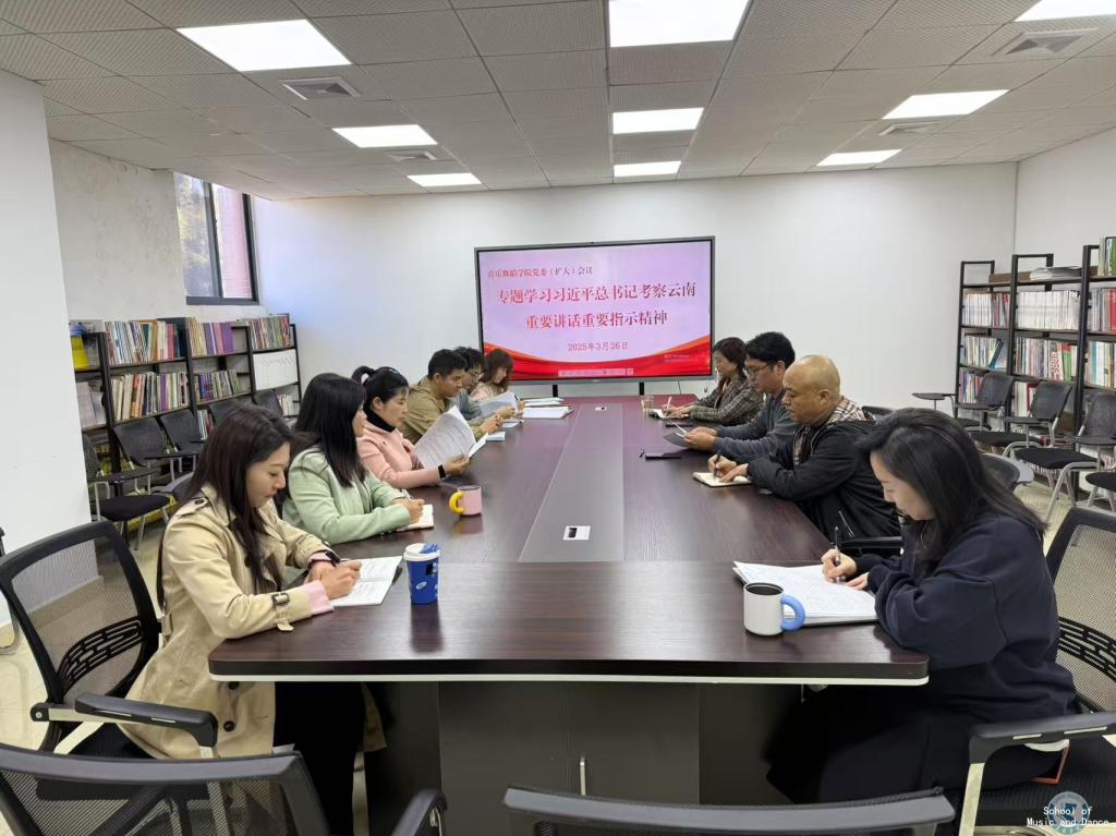 3月26日上午,学院党委书记李贵平主持召开学院党委(扩大)会议,传达学习习近平总书记在云南考察时的重要讲话重要指示精神,强调要切实把思想和行动统一到总书记重要讲话重要指示精神上来,统一到省委、学校党委的工作要求上来,不断增强思想自觉、政治自觉、行动自觉,牢记嘱托、感恩奋进,坚定沿着总书记指引的方向阔步前进,解放思想、改革创新,奋发进取、真抓实干,牢牢把习近平总书记的关心关怀转化为带领全院师生推动学院高质量发展的实际成效,坚定沿着习近平总书记指引的方向奋勇前进,以实际行动坚定拥护“两个确立”、坚决做到“两个维护”。
